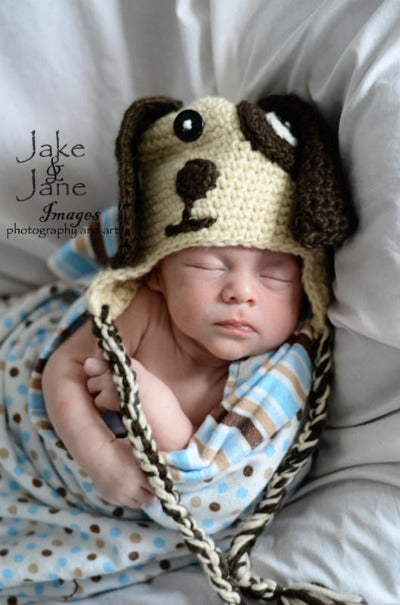 This crocheted ecru and brown puppy hat will cover his ears, keep him warm, and bring a smile to his face all the time.