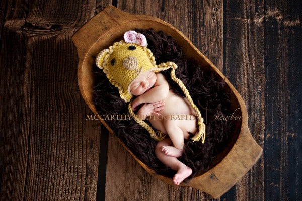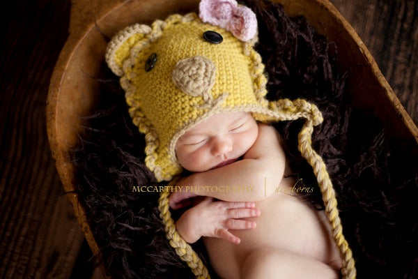 Crocheted in marigold yarn with a curly mane and light pink bow.