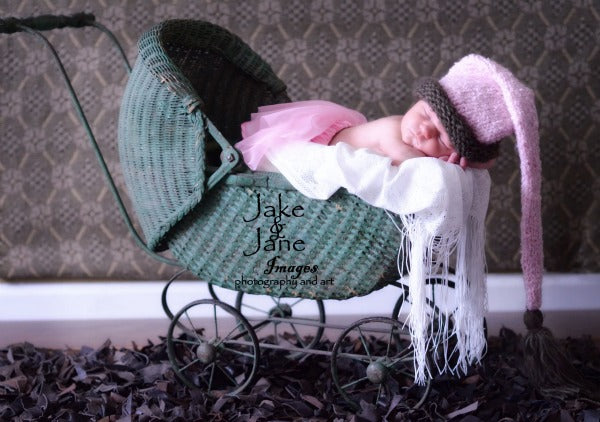 This super soft hat is offered in baby blue or baby pink. The base color is accented with a chocolate brown feather trim and a full chocolate tassel. Absolutely beautiful!