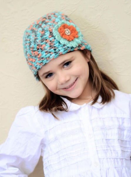The knubby crocheted hat has a very unique look. The hat boasts colors of turquoise, rust and chocolate. A wooden button in the center of the crocheted flower pulls the look together.