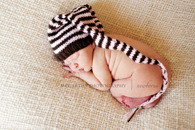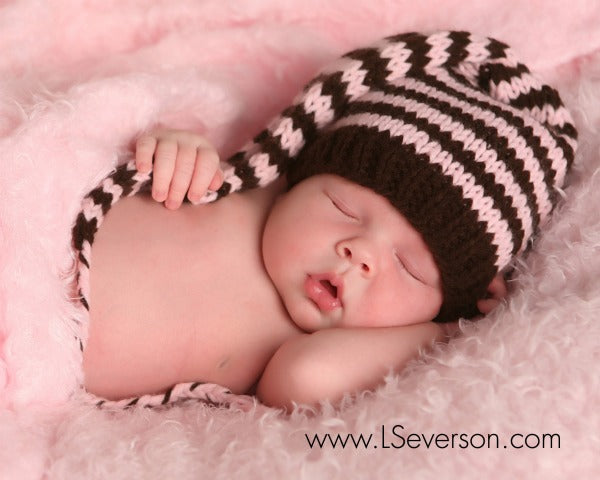 WOW!  We believe this is one of the cutest hats around!  Light pink and chocolate brown with a braided end, we're betting this pixie hat will be your favorite too!