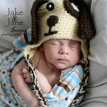This crocheted ecru and brown puppy hat will cover his ears, keep him warm, and bring a smile to his face all the time.