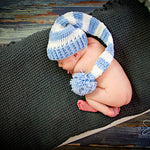 A long standing customer favorite. This soft handmade pom-pom hat is beautiful in photos. The large pom-pon can drape down the side or down the back. Finley in blue and white is available in 0-12 months