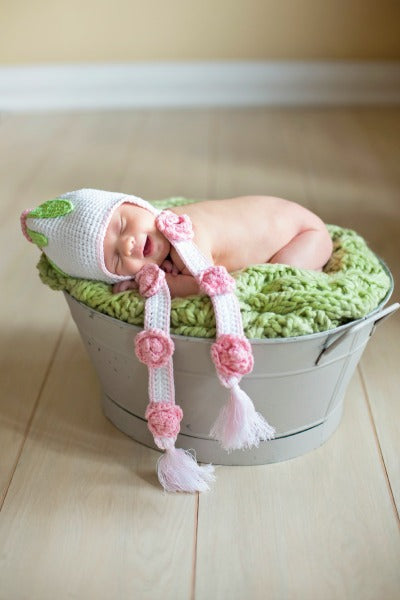 Ever so delicate! This hat is an heirloom made of the finest sea Island mercerized cotton. A pearl centered rose adorns the top with pink roses that trellis down each side.