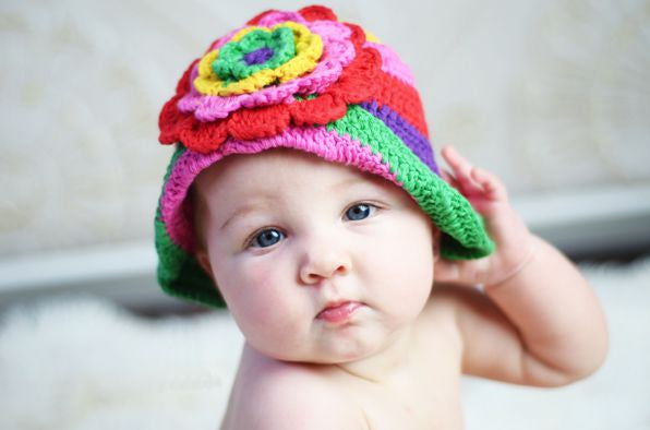 Crafted with expert care, the Gabby sunhat features hand-crocheted 100% breathable cotton in a vibrant rainbow palette. Its thoughtfully folded brim is secured by a large, layered daisy flower, combining playful charm with practical sun protection. This adorable design offers both comfort and style, making it perfect for sunny days.