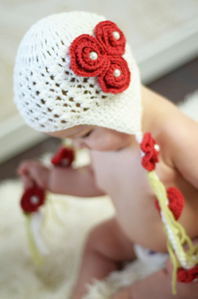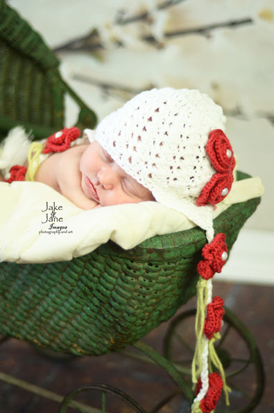 White mercerized cotton with three pearl centered red roses on the side. We have added six small pearl centered red roses that trail down each of the delicate side braids. A simply beautiful hat.